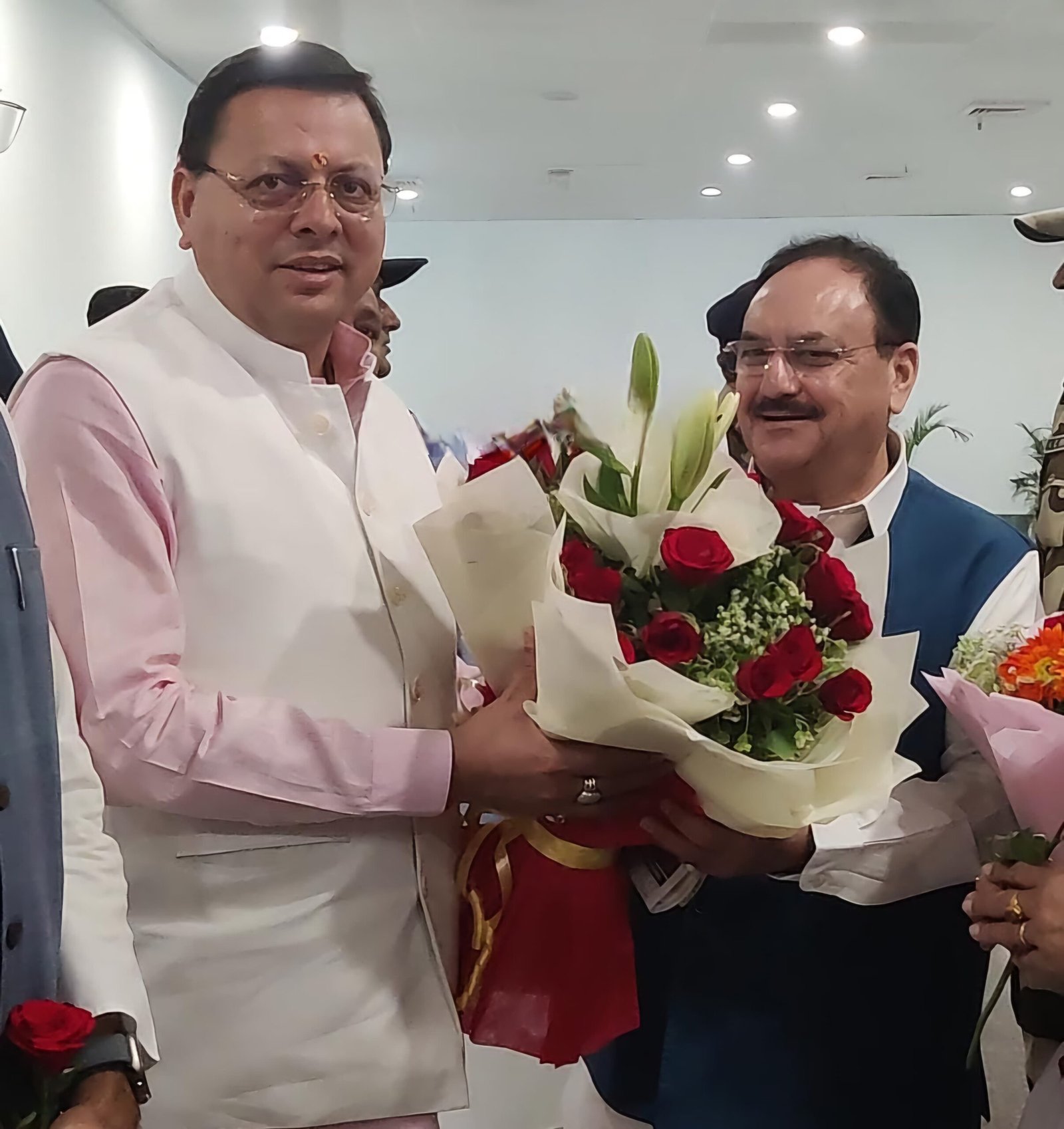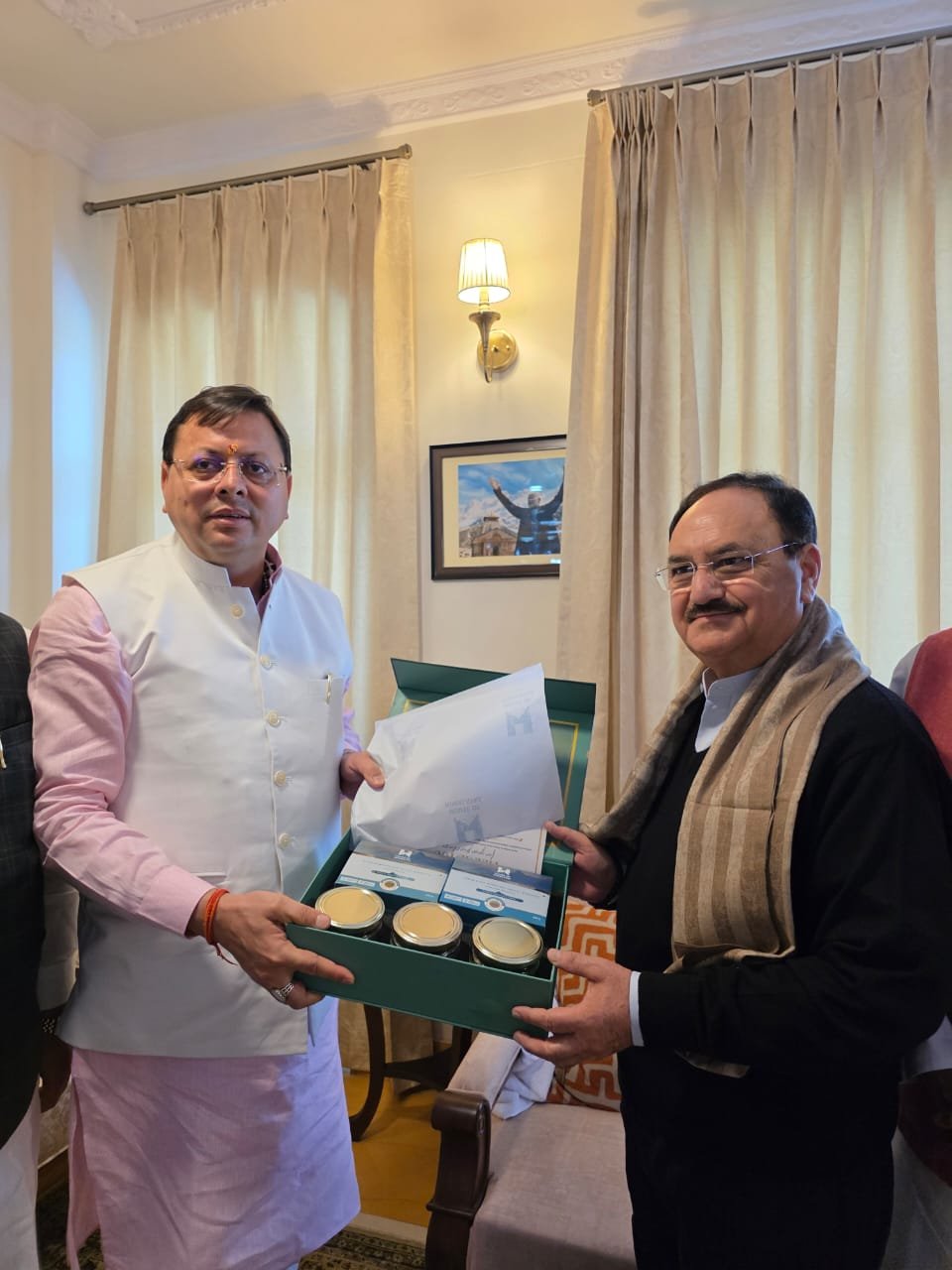 मुख्यमंत्री श्री पुष्कर सिंह धामी ने केंद्रीय स्वास्थ्य एवं परिवार कल्याण मंत्री और भाजपा के राष्ट्रीय अध्यक्ष श्री जे. पी नड्डा के देवभूमि उत्तराखंड आगमन पर जौलीग्रांट एयरपोर्ट पर स्वागत किया। इस अवसर पर मुख्यमंत्री ने उन्हें हाउस ऑफ हिमालयाज के उत्पाद भेंट किए।
