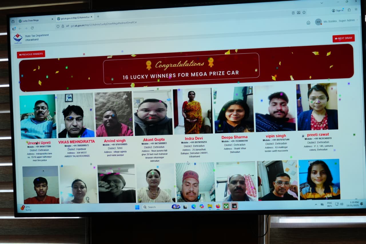 मुख्यमंत्री श्री पुष्कर सिंह धामी ने राज्य स्थापना रजत जयंती समारोह का शुभारंभ करते हुए शुक्रवार को सचिवालय में ‘बिल लाओ, ईनाम पाओ’ के अंतर्गत मेगा लकी ड्रॉ निकाला। राज्य कर विभाग, उत्तराखंड द्वारा आयोजित इस कार्यक्रम में कुल 1888 लकी ड्रॉ विजेता चुने गए। नैनीताल जनपद की सोनिया और टिहरी जनपद के जसपाल रावत ने प्रथम विजेता के रूप में एक-एक इलेक्ट्रिक कार जीती।