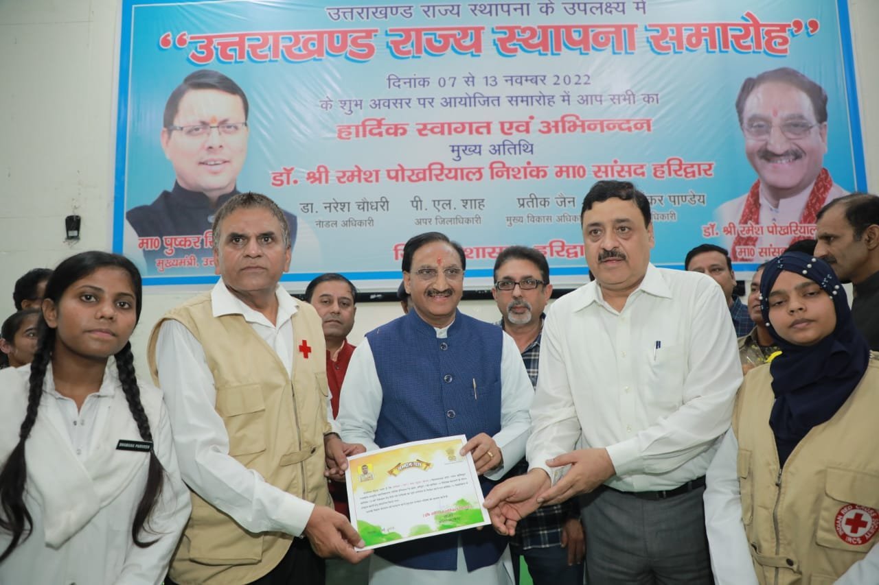 हरिद्वार। ऋषिकुल राजकीय आयुर्वेद महाविद्यालय के शरीर रचना विभागाध्यक्ष/सचिव इण्डियन रेडक्रास डा0 नरेश चौधरी को हरिद्वार लोक सभा सासंद डा0 रमश पोखरियाल निशंक ने उत्तराखण्ड राज्य स्थापना वर्ष समारोह के उपलक्ष्य पर गत दिवस ऋषिकुल राजकीय महाविद्यालय सभागार में अपने मूल दायित्वों के साथ साथ जन समाज में की गई उत्कृष्ट एवं समर्पित सेवाओं के लिए विशेष रूप से सम्मानित किया गया। लोक सभा सांसद डा0 रमेश पोखरियाल निशंक ने कहा कि डा0 नरेश चौधरी ने कुम्भ मेला, अर्द्ध कुम्भ मेला, कावंड़ मेला एवं अन्य राष्ट्रीय कार्यक्रमों एवं आयोजनों में उत्कृष्ट कार्य किये हैं। साथ ही साथ पूर्व में उत्तराखण्ड में आई देवीय आपदाओं में डा0 नरेश चौधरी द्वारा किये गये सराहनीय एवं उत्कृष्ट कार्य भी उल्लेखनीय हैं तथा सम्पूर्ण कोरोना काल तथा वर्तमान में वैक्सीनेशन में जो समर्पित भावना से की गई सेवा अतुलनीय है। जिनके लिए डा0 नरेश चौधरी को पूर्व में भी समय समय पर उच्च सम्मानों से प्रोत्साहित किया गया है। उत्तराखण्ड राज्य स्थापना दिवस समारोह में भी डा0 नरेश चौधरी को सम्मानित किया जाना एक विशेष गौरव की बात है।