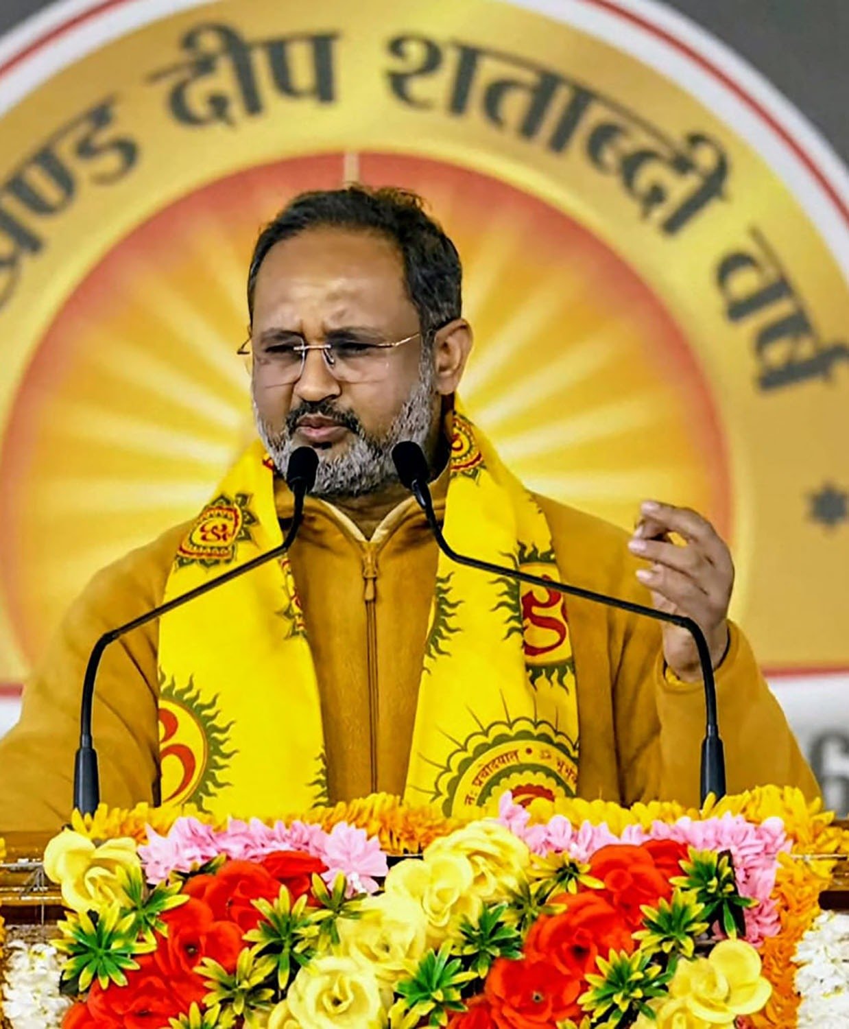 शताब्दी समारोह के दलनायक डॉ चिन्मय पण्ड्या ने कहा कि यह आयोजन सभी के लिए हम सभी के सौभाग्य का दिन है, जो पूज्य माताजी के अवतरण के शताब्दी वर्ष से जुड़ा हुआ एक ऐतिहासिक एवं आध्यात्मिक अवसर है। डॉ. पण्ड्या जी ने कहा कि यह भूमि योगियों और साधकों की रही है, जहाँ से स्वाभिमान, साधना और तप की परंपरा ने राष्ट्र को दिशा दी है। उन्होंने पूज्य गुरुदेव पंडित श्रीराम शर्मा आचार्य जी के संदेशों का स्मरण करते हुए कहा कि जीवन में आने वाली बाधाओं से घबराना नहीं चाहिए, बल्कि उन्हें परिवर्तन और प्रगति का माध्यम बनाना ही साधक का कर्तव्य है। स्वामी विवेकानंद के विचारों का उल्लेख करते हुए उन्होंने कहा कि भारत करुणा, दया और ज्ञान की भूमि है तथा भारत के जागरण में ही सम्पूर्ण विश्व का जागरण निहित है। डॉ. पण्ड्या जी ने राष्ट्र-निर्माण के इस यज्ञ में सभी से सक्रिय सहभागिता का आह्वान किया। इससेे पूर्व राष्ट्र जागरण के समय आ गया है विषय पर आयोजित सभा में गायत्री परिवार के संस्थापक युगऋषि पं श्रीराम शर्मा के जीवनवृत्त पर आधारित डॉक्यूमेंट्री दिखाई गयी।