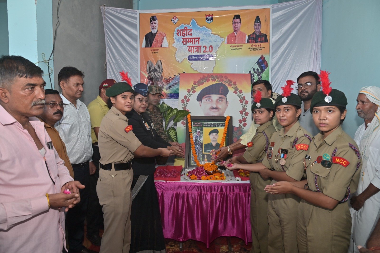 तत्पश्चात् शहीद सम्मान यात्रा जनपद के द्वितीय शहीद नायक प्रदीप कुमार, जो कि दिनांक 27 अक्टूबर 2023 को सिक्किम क्षेत्र में शहीद हुए थे, के ग्राम गदरजुडा के लिये प्रस्थान किया, जहां पर नारसन ब्लाक प्रमुख श्री कविन्द्र चौधरी, ग्राम प्रधान गदरजुडा श्री भूपेन्द्र सिंह व समस्त ग्रामवासियों द्वारा स्वागत किया गया एवं शहीद सैनिक को श्रृद्धांजति के पश्चात शहीद सैनिक की पत्नी श्रीमती कविता चौधरी एंव परिवार के सदस्यों द्वारा घर-आंगन की मिटट्टी का ताम्र कलश जिला सैनिक कल्याण अधिकारी को हस्तगत किया गया।