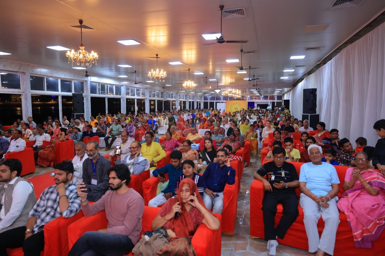 स्वामी जी और साध्वी जी ने संस्कृति को समर्पित कार्य करने वाले समर्पित, सैस फाउंडेशन के अध्यक्ष श्री शक्ति बक्शी जी, श्री विश्व मोहन जी और उनकी पूरी टीम पदाधिकारियों और सभी कलाकारों को अंगवस्त्र और रूद्राक्ष का पौधा भेंट कर उनका अभिनन्दन किया। इस अवसर पर कोलकाता से विशेष रूप से आये श्री सुधीर जालान जी, श्रीमती अलका जालान जी का भी अभिनन्दन कर आशीर्वाद दिया। श्री सुधीर जालान जी ने पूज्य स्वामी जी के आशीर्वाद से कोलकाता में विशाल रूप से गंगा जी की आरती का क्रम शुरू किया है।