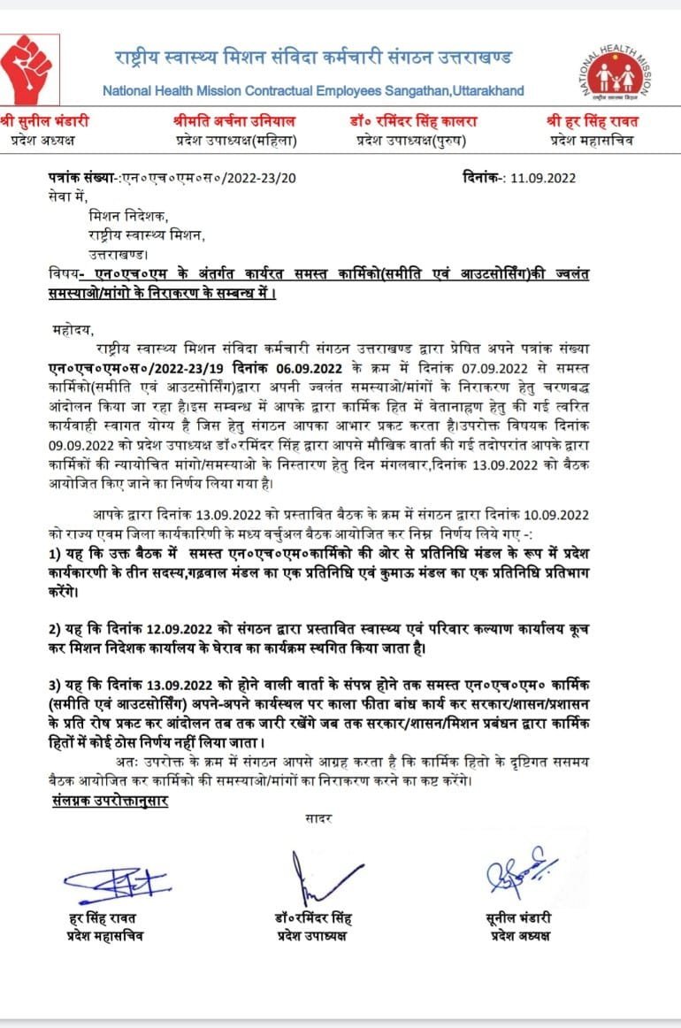 देहरादून। राष्ट्रीय स्वास्थ्य मिशन संविदा कर्मचारी संगठन उत्तराखंड ने सोमवार दिनांक 12-09-2022 को स्वास्थ्य एवं परिवार कल्याण कार्यालय कूच कर मिशन निदेशक कार्यालय के घेराव का कार्यक्रम स्थगित कर दिया। साथ ही संगठन ने निर्णय लिया कि मंगलवार दिनांक 13-09-2022 को होने वाली वार्ता के संपन्न होने तक समस्त एन एच एम कार्मिक (समिति एवं आउटसोर्सिंग) अपने अपने कार्यस्थल पर काला फीता बांध कार्य कर सरकार/शासन/प्रशासन के प्रति रोष प्रकट कर आन्दोलन जारी रखेंगे। कार्मिक तब तक आन्दोलन जारी रखेंगे जब तक कार्मिकों के हितों में सरकार/शासन/मिशन प्रबंधन द्वारा कोई ठोस निर्णय नही लिया जाता।