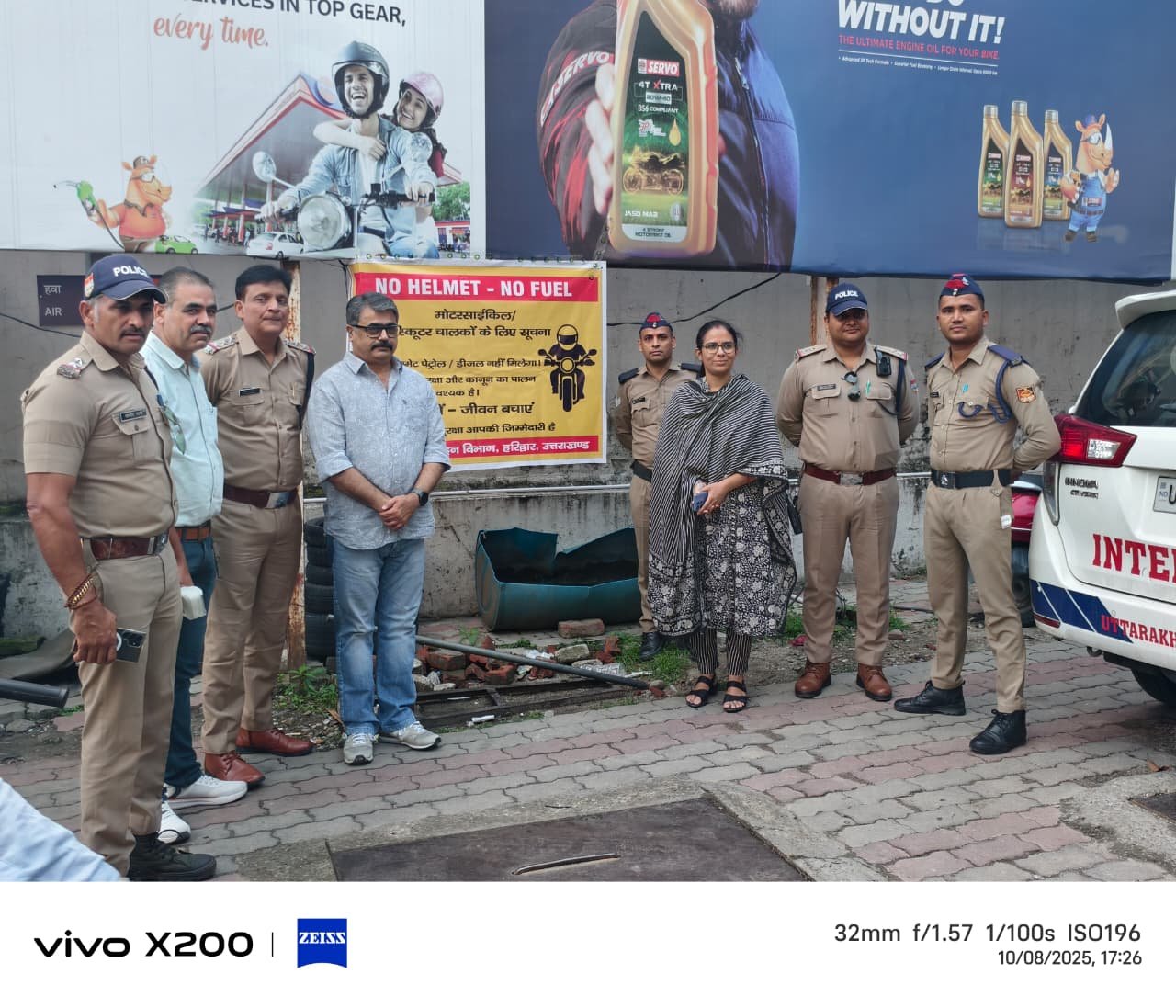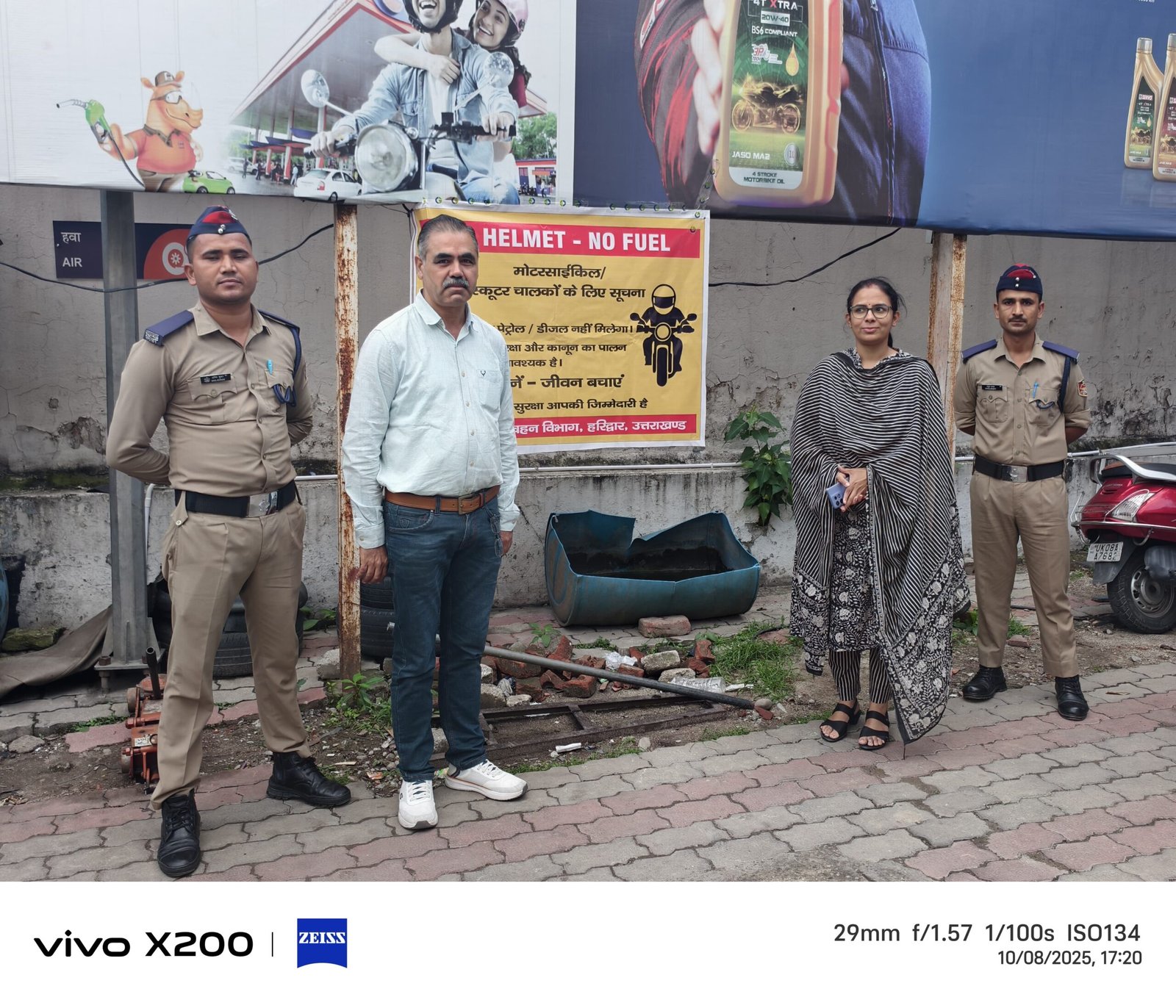 उपरोक्त अभियान के क्रम में आज यातायात पुलिस के सहयोग से हरिद्वार क्षेत्र के विभिन्न पेट्रोल पंपों पर बैनर लगाए गए तथा पेट्रोल पंप के मालिकों, कर्मचारियों तथा पेट्रोल लेने आने वाले व्यक्तियों को हेलमेट के महत्व के प्रति जागरूक किया गया ।