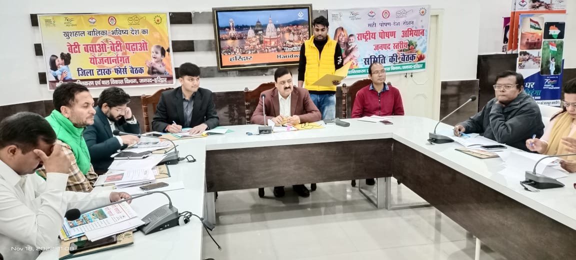 हरिद्वार। बेटी बचाओं बेटी पढ़ाओं योजना के क्रियान्वयन एवं अनुश्रवण हेतु गठित जिला स्तरीय टास्क फोर्स समिति व राष्ट्रीय पोषण मिशन योजनान्तर्गत गठित जिला स्तरीय समिति की बैठक जिलाधिकारी विनय शंकर पाण्डेय की अध्यक्षता में जिला कार्यालय सभागार में सम्पन्न हुई। लड़के एवं लड़कियों के लिंग अनुपात की दर को संतुलित बनाये रखने के लिए जिलाधिकारी ने सम्बन्धित अधिकरियों को निर्देश दिये कि ग्राम पंचायत, क्षेत्र पंचायत, जिला पंचायत व नगर निकायों की बैठकों में बैठक के पहले एजेण्डे बिन्दु के रुप में बेटी बचाओं बेटी पढ़ओं की शपथ व अन्य प्रचार-प्रसार को शामिल करें।