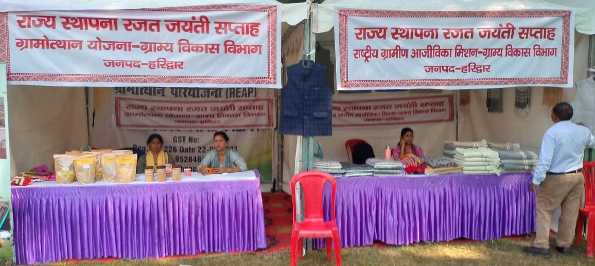 हरिद्वार। उत्तराखंड राज्य स्थापना के २५ गौरवशाली वर्ष पूर्ण होने के उपलक्ष में मुख्यमंत्री पुष्कर धामी के निर्देशन में रजत जयंती सप्ताह कार्यक्रम आयोजित किए जा रहे हैं जनपद के मुख्य कार्यक्रम ऋषिकुल राजकीय आयुर्वेदिक महाविद्यालय परिसर एवं आडिटोरियम में कार्यक्रम आयोजित किए जा रहे हैं। इस अवसर पर ग्राम्य विकास विभाग, हरिद्वार द्वारा लगाए गए स्टॉल के माध्यम से स्वयं सहायता समूहों (Self Help Groups – SHGs) के उत्पादों की बिक्री की गई। इस स्टॉल को लोगों का भरपूर समर्थन मिला और ग्रामीण महिलाओं द्वारा तैयार किए गए उत्पादों ने खूब सराहना बटोरी।