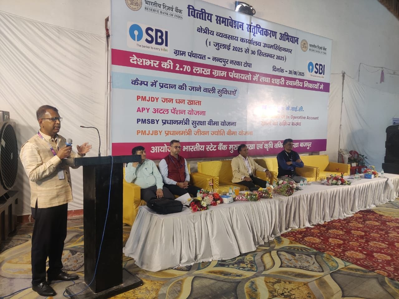 भारतीय स्टेट बैंक, शाखा बाजपुर के सौजन्य से आज दिनांक 28 अगस्त 2025 को एक सैचुरेशन कैम्प का आयोजन किया गया। इस अवसर पर मुख्य अतिथि के रूप में श्री अरविंद कुमार, क्षेत्रीय निदेशक, भारतीय रिज़र्व बैंक, उपस्थित रहे।