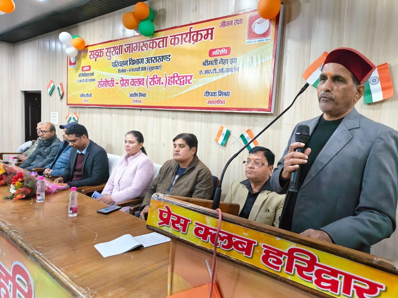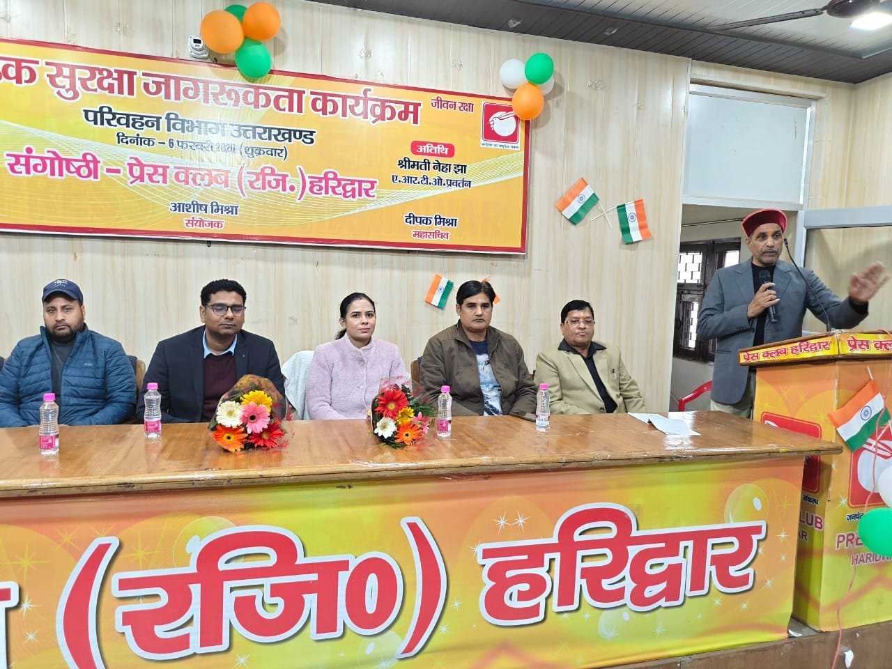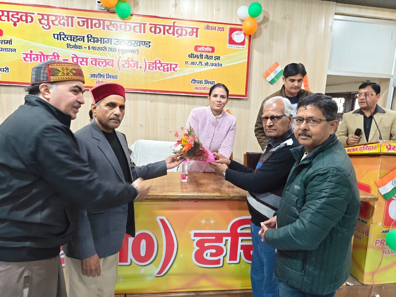 हरिद्वार। सड़क दुर्घटनाओं पर प्रभावी अंकुश लगाने और आमजन को यातायात नियमों के प्रति जागरूक करने के उद्देश्य से सड़क सुरक्षा जागरूकता कार्यक्रम के तहत परिवहन विभाग हरिद्वार द्वारा प्रेस क्लब में संगोष्ठी का आयोजन किया गया। कार्यक्रम में परिवहन विभाग के अधिकारी, प्रेस क्लब पदाधिकारी एवं पत्रकार मौजूद रहे। मुख्य अतिथि एआरटीओ प्रशासन निखिल शर्मा तथा विशिष्ट अतिथि एआरटीओ प्रवर्तन नेहा झा ने यातायात नियमों की जानकारी देते हुए दुघर्टनाओं से बचाव के लिए वाहन चलाते समय नियमों का पालन करने, सीट बेल्ट लगाने और दोपहिया वाहन चलाने के दौरान हेलमेट अवश्य लगाने की अपील की और सभागार में मौजूद सभी पत्रकारों को यातायात नियमों का पालन करने की शपथ भी दिलायी। इस दौरान परिवहन विभाग की और से सभी पत्रकारों को हेलमेट भी वितरित किए गए। प्रेस क्लब अध्यक्ष धर्मेंद्र चौधरी, महामंत्री दीपक मिश्रा एवं कार्यक्रम संयोजक आशीष मिश्रा ने सभी अतिथियों का पुष्पगुच्छ भेंट कर स्वागत किया। गोष्ठी का संचालन प्रेस क्लब महामंत्री दीपक मिश्रा ने किया।