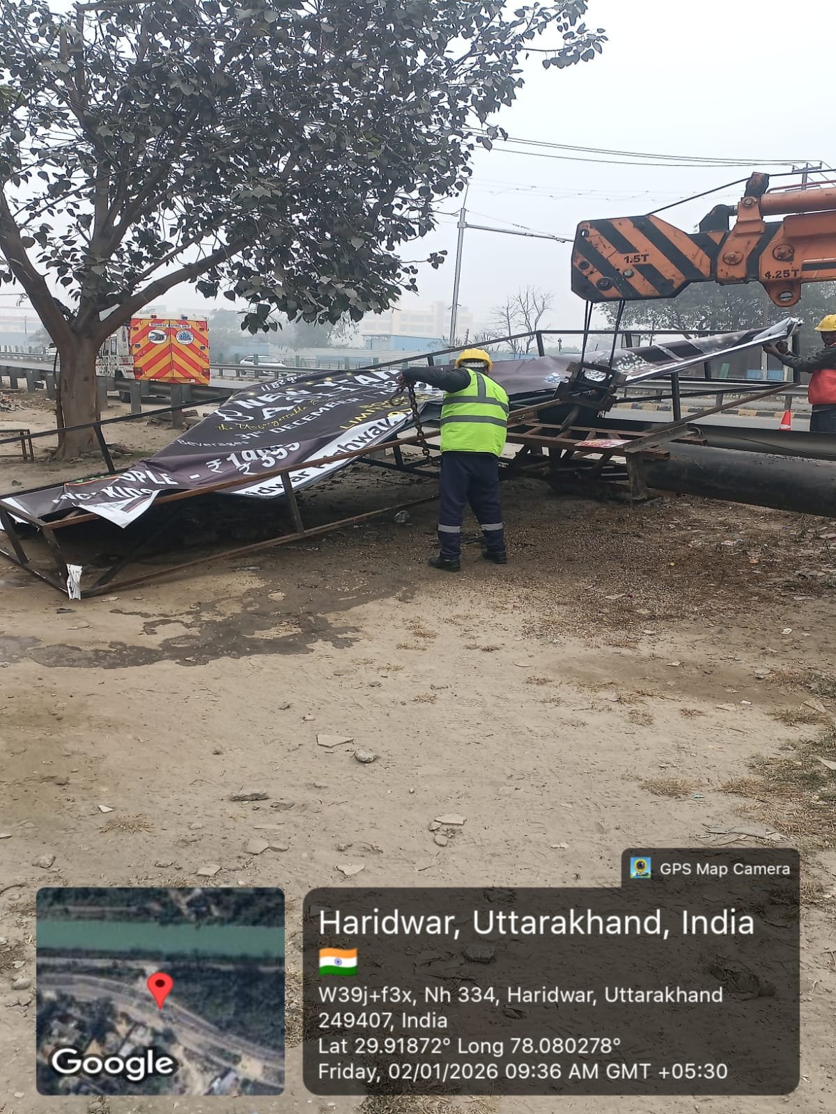 अधिशासी अभियंता एनएचएआई अतुल शर्मा ने अवगत कराया है कि जिलाधिकारी के निर्देशों के अनुपालन में राष्ट्रीय राजमार्ग संख्या 334 के किनारों से एवं रानीपुर झाल से बहादराबाद बाईपास तक एवं मंगलौर क्षेत्रांतर्गत अवैध रूप एवं बिना अनुमति के लगाए गए होर्डिंग एवं 14 बड़े यूनीपोल को राष्ट्रीय राजमार्ग प्राधिकरण द्वारा अधिकृत एजेंसी की टीम द्वारा हटाया गया। उन्होंने यह भी अवगत कराया है कि राष्ट्रीय राजमार्ग के किनारे बनाए गए खोखे, झुगी झोपड़ी को भी हटाया जा रहा है।